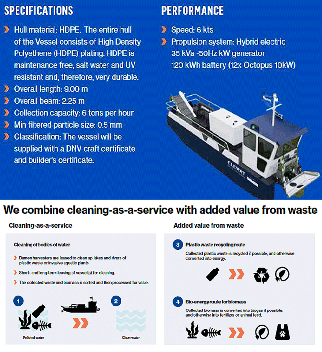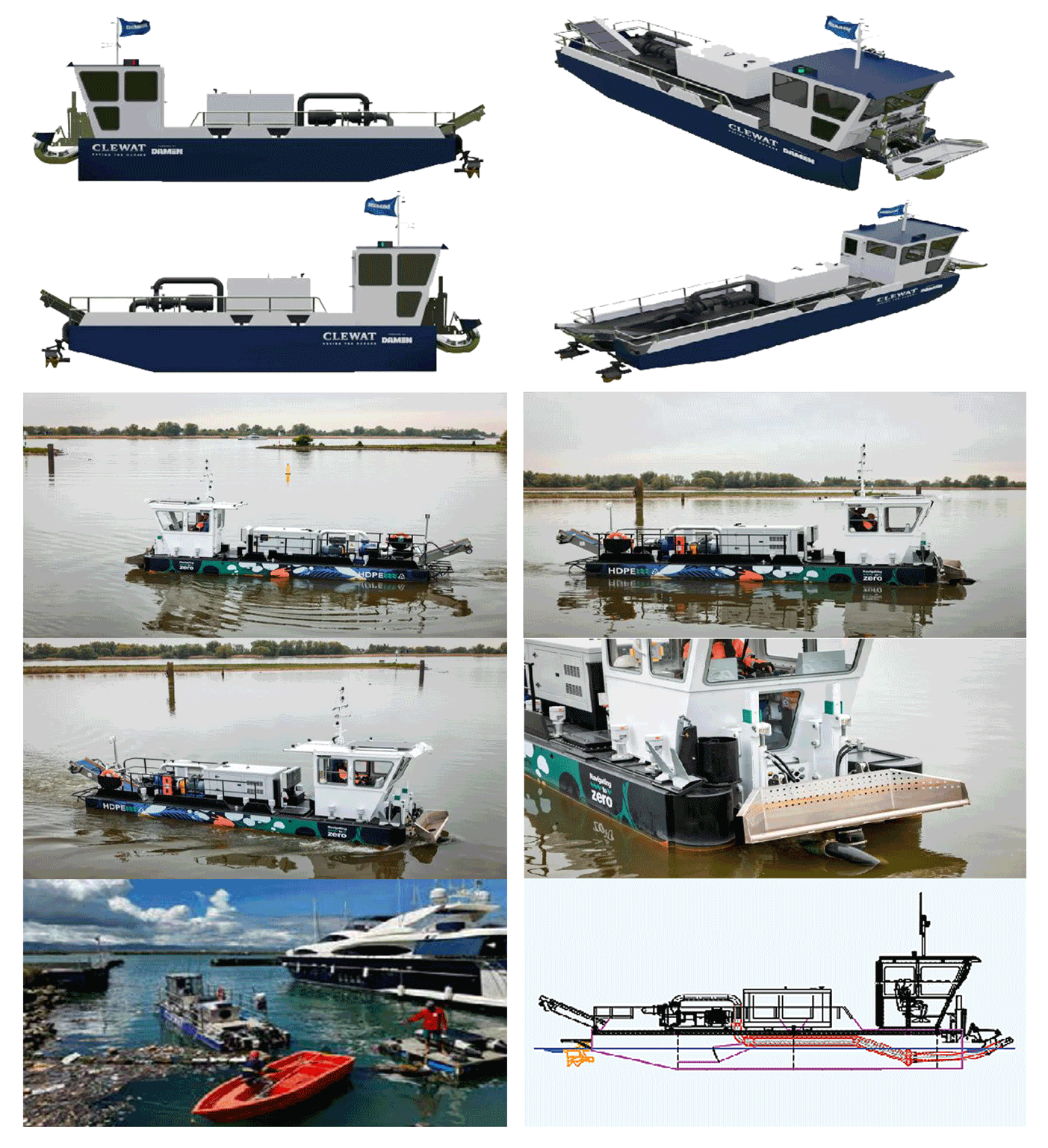 RIVER SCOOPER 902 HDPE The DRS 902-HDPE is a compact, container-sized hybrid craft, designed for zero-emission, fully electric operation in the future. The vessel is efficiently operated by just one person, but can accommodate two crew members comfortably. As an additional boost to sustainability, the River Scooper’s floaters are also made from fully recyclable HDPE.